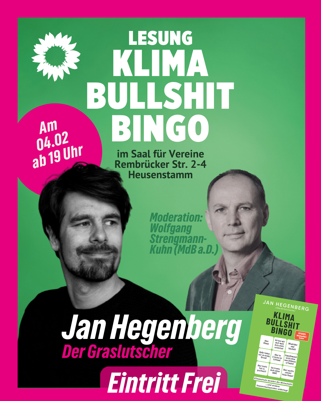 Für Mittwoch, 04. Februar 2026 lädt Bündnis90/Die Grünen Heusenstamm anlässlich der anstehenden Kommunalwahlen alle interessierten Bürgerinnen und Bürger zu einer besonderen Lesung mit dem bekannten Klima-Autor und Blogger Jan Hegenberg ein. Die durch Wolfgang Strengmann-Kuhn moderierte Veranstaltung beginnt um 19 Uhr und findet im Saal für Vereine in Heusenstamm – Rembrücker Straße 2-4 - statt. Unter dem Titel „Bullshit-Klima-Bingo“ nimmt Hegenberg – vielen besser bekannt als „Der Graslutscher“ – auf unterhaltsame und zugleich faktenbasierte Weise die gängigsten Mythen und Irrtümer rund um den Klimaschutz aufs Korn. Mit einer Mischung aus Humor, wissenschaftlicher Genauigkeit und verständlicher Sprache räumt er auf mit Aussagen wie „Deutschland kann doch alleine nichts ausrichten“ oder „Klimaschutz ist nur was für Reiche“.